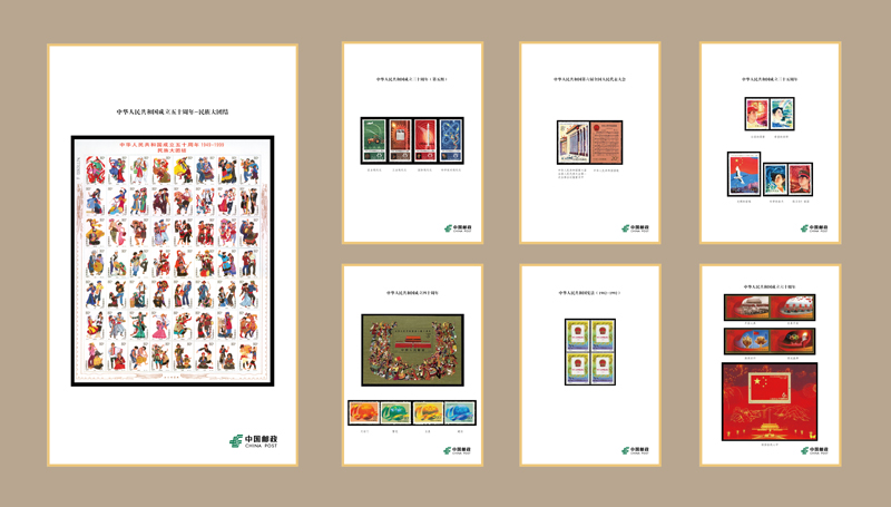 第三展柜展示的是建国题材邮票,在这里我们看到的是《中华人民共和国成立五十周年——民族大团结》邮票,全套56枚在一个版上,表现了56个民族身着民族盛装、载歌载舞,迎接共和国五十周年大庆的场景,这套邮票是迄今为止我国发行枚数最多的一套邮票。