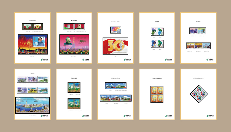 第五展柜展示的是港澳回归、特区建设等纪念邮票。这里我们看到1997年7月1日发行的《香港回归祖国》邮票和小型张与1999年12月20日发行的《澳门回归祖国》邮票和小型张。