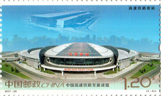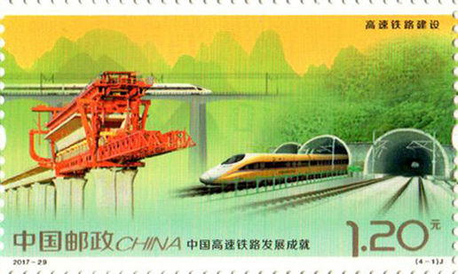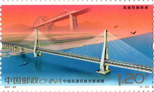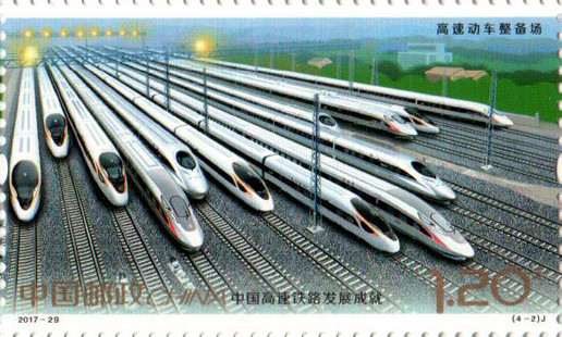 2017年11月25日,中国邮政发行《中国高速铁路发展成就》纪念邮票1套4枚,小型张1枚。图案内容分别为:高速铁路建设、高速动车整备场、 高速铁路桥梁、高速铁路客站,小型张内容为“复兴号”动车组。该套邮票设计者为沈嘉宏,小型张设计者为尚盈。