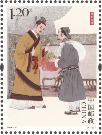 中国五千年的文明史中,刚正不阿、廉洁自律的仁人志士,留下了许多脍炙人口的廉政故事,在华夏文化中已成经典。中国邮政于2018年6月24日发行《清正廉洁(一)》特种邮票1套4枚,邮票图案名称分别为:不贪为宝、羊续悬鱼、两袖清风和立檄拒礼。该套邮票由胡博综设计,邮票以中国传统绘画的艺术形式,生动还原了四个典故的历史场景。