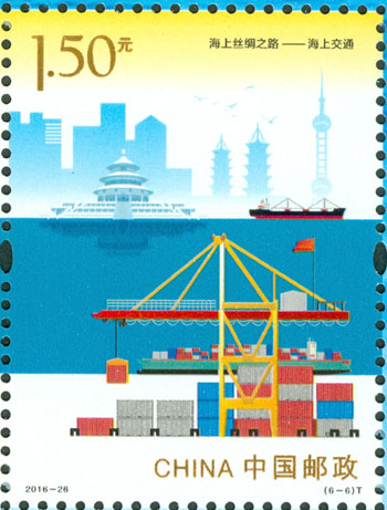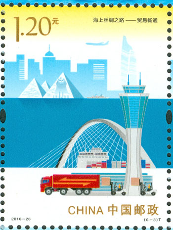 2016年9月10日,中国邮政发行《海上丝绸之路》特种邮票一套6枚,小全张1枚,邮票内容分别为:政策沟通、设施联通、贸易畅通、资金融通、民心相通、海上交通。该套邮票采用六枚联票形式设计,以画面中部的海平面进行串联,将画面分割为前景主题与背景。小全张边饰以海洋为背景。晨光初现,灯塔指引的灯光尚未熄灭,一轮红日由海平面冉冉升起,喻示着21世纪海上丝绸之路的崭新开始与光明前景。该套邮票由何洁、周岳设计。