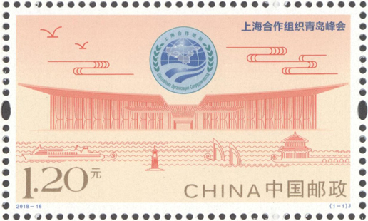 上海合作组织成员国元首理事会第十八次会议于2018年6月9日至10日在山东省青岛市举行,中国邮政于2018年6月9日发行《上海合作组织青岛峰会》纪念邮票1套1枚。邮票以上海合作组织会徽及主场馆——青岛国际会议中心线描图为主要元素,以祥云、海鸥为装饰;画面下方以线描手法,表现海上栈桥、帆船、灯塔、轮船等景物,展现了会议举办地——黄海明珠青岛的特色,整体设计简洁明快,主题突出。该套邮票由于秋艳、邢文伟设计。