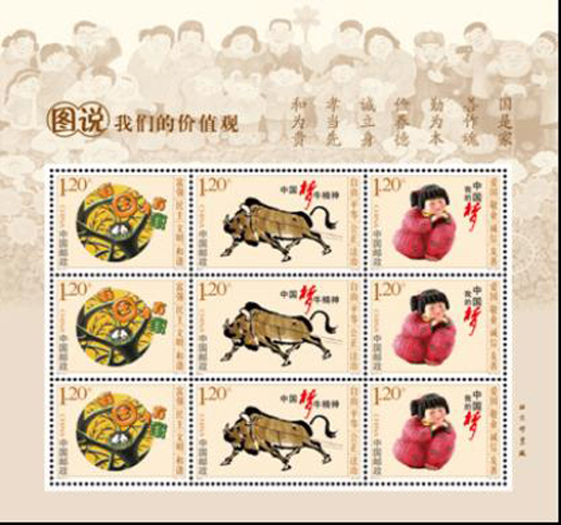 2015年11月29日,中国邮政发行《图说我们的价值观》特种邮票一套3枚。邮票内容选取了“鸟巢”“牛精神”“梦娃”三个画面,文化形式丰富多彩,内容积极向上,形象地宣传和阐述了社会主义核心价值观。该套邮票由夏竞秋设计。