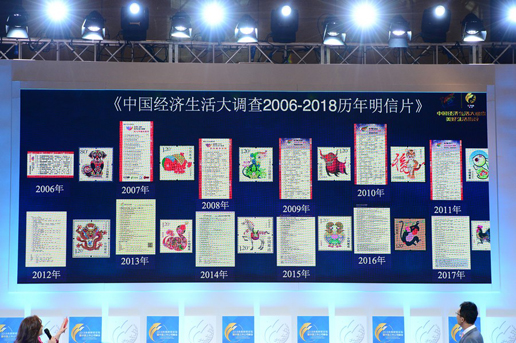 在启动仪式现场,主持人与大家一同回顾了“中国经济生活大调查”历年明信片、信卡;现场播放的短片,讲述了邮递员是如何将明信片、信卡送到老百姓手上,又是如何进行问卷调查的。