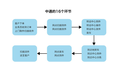 中通快递在京津冀地区以生产路由和快件市场为中心进行整合,张家口、承德、唐山、秦皇岛尽管从行政区划上隶属于河北,但在邮路组织上,他们隶属于北京和天津管理中心。在路由的调整上,中通快递设置了北京、唐山、邢邯、沧衡、保定等分拨中心,实现了分拣场地、分拨中心的联通,带动京津冀一体化。中通快递还在京津冀地区加开了多辆网运班车,点对点多频次,以保证时效,并将收发运投4大环节细化为16个层级(见图表1),逐层进行管控,以标准化模式进行管理,使粗放的管理越来越精细化了。