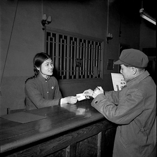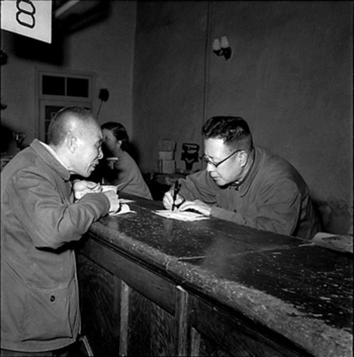 1958年4月,北京东四邮电局,在邮局工作了30多年的于鸿泽(图右)积极为顾客填写单据。工人日报 杜治 摄