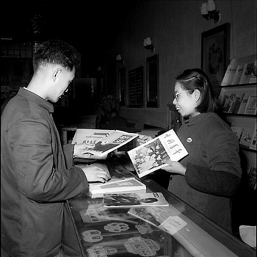 1958年4月,北京。沈秀敏(图右)对顾客很热情,她总是拿着各种杂志主动向顾客介绍。工人日报 杜治 摄