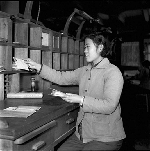 1959年,全国群英会代表、北京市东四邮电局投递员罗淑珍投递前在做准备工作。工人日报 王光禄 摄