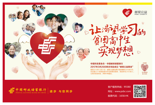 2017年以来,邮储银行陆续在河北、山西、内蒙古、安徽、江西等地的33个贫困县高中开设“邮爱自强班”,依托“邮爱公益基金”持续资助1650名贫困高中生的部分学习生活费用,向759名考入大学的贫困高中毕业生发放“邮爱奖学金”,帮助他们更好地衔接大学生活。