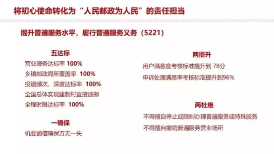 针对中央巡视指出的我们存在“无视、忽视、轻视、漠视”普遍服务的问题,普遍服务责任落实有差距,普遍服务质量管控有差距,普遍服务质量信息化支撑有差距,普遍服务网络效能有差距,我们要努力提升普遍服务水平,履行普遍服务义务,实现“5221”目标。