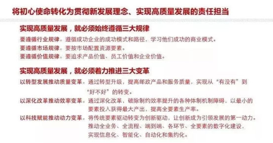 根据中央要求,结合邮政实际,刘爱力强调指出,中国邮政要将“不忘初心、牢记使命”转化为新时代邮政的责任担当,切实做到“六个转化”。