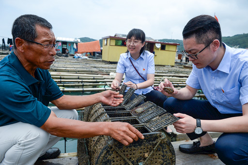 今年鲍鱼喜迎丰收,养殖户正津津乐道地向信贷员介绍鲍鱼的喜人长势。
