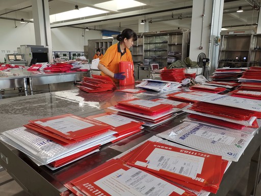 7月24日下午,哈尔滨邮区中心局高考录取通知书的分拣作业现场一派忙碌,12名分拣员一字排开,紧张有序地分拣着邮件。这是提前批次和一本类院校的录取通知书带来的小高峰,随后还会有两批录取通知书邮件高峰到来。