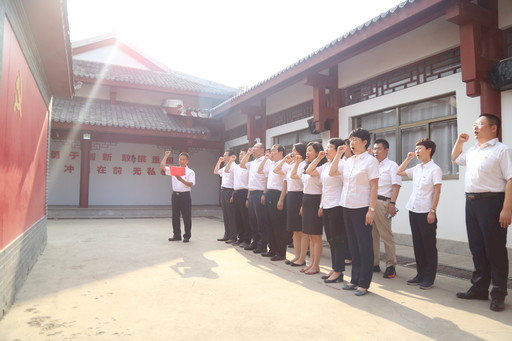 山东省分行党员干部在山东原山艰苦创业教育基地重温入党誓词。