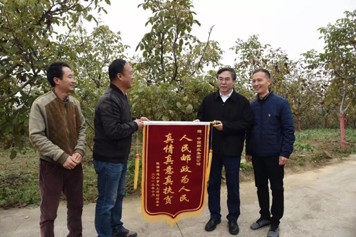 在上河村核桃林,刘爱力一行听取了集团公司派驻上河村开展扶贫工作的第一书记王海珍关于核桃种植项目的情况介绍,询问了当地核桃种植以及群众收益情况。当他了解到通过开展电商销售及林下种植,当地贫困户户均年增收3600元以上,高兴地连声说好。他同时对邮政扶贫干部长期以来的辛勤工作表示感谢,鼓励他们要克服困难,要在驻村工作的过程中有所收获。“感谢邮政扶真贫!”上河村村委会代表激动地向刘爱力赠送了写有“人民邮政为人民 真情真意真扶贫”字样的大红锦旗,不住地表达着对于邮政扶贫工作和邮政扶贫干部的真诚感谢。