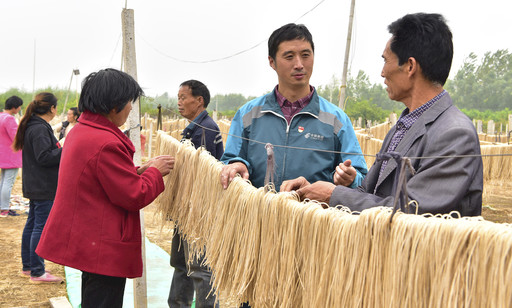 江苏省丰县邮政分公司王沟镇乡邮员赵本增热心帮助当地百姓脱贫致富。图为10月12日,赵本增途经粉条晾晒基地,主动提议用自己的“农民致富微信朋友圈”发信息帮经营业主卖粉条。 □卜庆海 刘立明 摄影报道