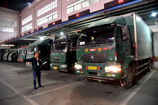 11月11日凌晨,湖北省武汉邮区中心局调度员杨成刚忙着指挥车辆进出垛口。 □郝振宁 摄影报道