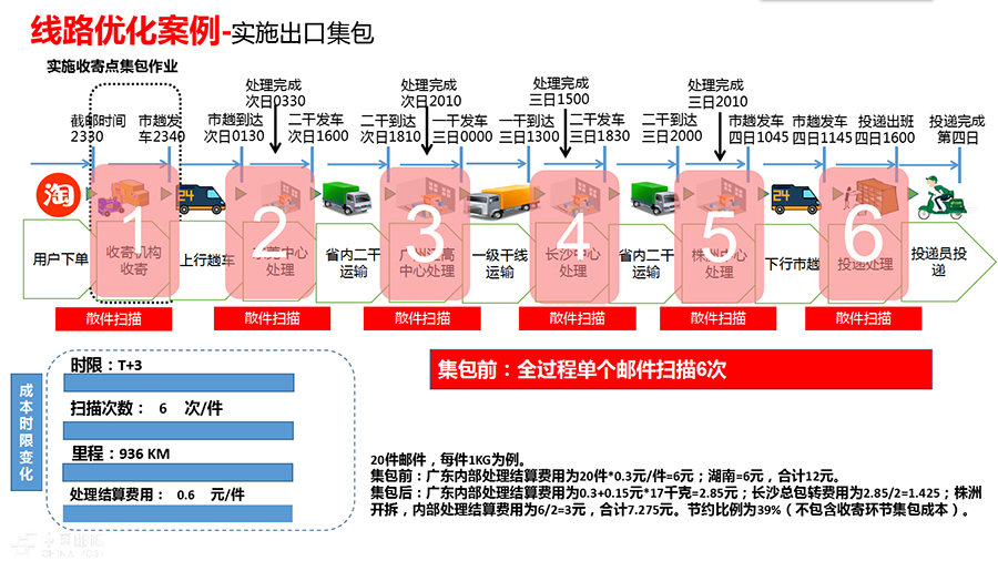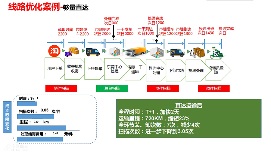 邮路要怎么捋?就是要以和竞争对手对标为任务,对每条线路从收寄到投递进行全环节梳理、全链路优化。以广东东莞—湖南株洲线路为例:这条线路目前日均包件量1000件,在全散件模式下,由于没有直达邮路,邮件从收寄到投递,每个邮件全程需经过6次散件分拣,11次散件装卸搬运,时限T+3。通过全环节捋、全流程捋、各环节优化,改为在东莞实施前置集包,散件在收寄网点直接分拣封入株洲总包,同时开通东莞—株洲直达邮路,邮件由原来在东莞—广州—长沙—株洲间散件装卸,优化为东莞—株洲总包装卸。通过这两种优化措施的结合,邮件由散件分拣6次、装卸搬运11次,将变为散件分拣3次、总包分拨3次、装卸搬运7次,减少了广州和长沙的4次总包装卸作业,处理结算费用降低39%,装卸效率大幅提升;时限水平由T+3将减少为T+1,达到次日递,超过主要竞争对手;全程运输里程从936公里将缩短为720公里,减少了23%,节约了运输成本。此外,在该线路日均邮件量较少的情况下,可以采取组开深圳—东莞—株洲串行直达的运输方式,在提高车辆装载率的同时,实现当天收寄的东莞—株洲邮件和18点前收寄的深圳—株洲邮件全程时限T+1。