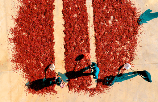 除了银杏,辣椒市场也给邮政业务拓展带来了新的机遇。这不,红火的晾晒场上也有绿衣人帮扶的身影。