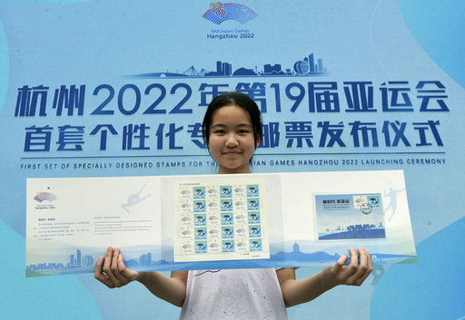 小邮迷展示杭州亚运会个性化邮票。王建民 摄