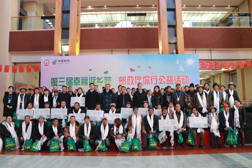 12月23日,中国邮政集团公司西藏自治区分公司与青藏铁路公司拉萨站共同举行第三届“幸福返乡路 邮政伴你行”免费赠送火车票公益活动,是深入贯彻落实党的十九届四中全会精神、全心全意为人民谋幸福的又一次具体举措,也是西藏自治区各级党委政府和社会各界关爱外来务工人群、致谢美丽西藏建设者的又一次具体体现,更是西藏邮政积极履行央企的政治担当和社会责任,践行“人民邮政为人民”服务宗旨的又一次具体行动。自2017年以来,西藏邮政已经连续3年开展了“幸福返乡路·邮政伴你行”公益活动,广大在藏务工人员热烈响应、积极参与,多家媒体争相宣传报道,引起了良好的社会反响,达到了“替政府分忧,为百姓解愁”的目的。