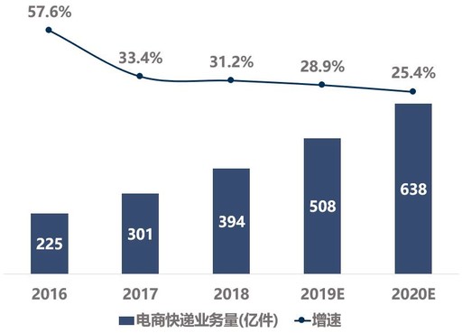 保持高位增长。2019年1月至11月,全国实物商品网上零售额为8.5万亿元,同比增长19.5%,增速进一步放缓。结合申万宏源证券预测结果,2020年,国内电商快递业务量增速将在25%左右。(见图4)