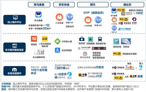 争夺个人寄件市场,拓展业务来源。加快布局线上线下个人寄件流量入口,快递企业纷纷接入菜鸟裹裹、小米快递等第三方线上寄件平台,并通过官方在线寄件平台发力会员营销;同时,不断拓展末端自有服务网点、社会门店(代寄)、线下快递代收平台、智能快递柜等寄件接口。围绕个人寄件需求布局多元服务场景,菜鸟裹裹从退换货延伸到办公、二手交易等寄件场景,快递公司围绕出行、本地生活、就医等场景推出全新寄件产品。(见图6)
