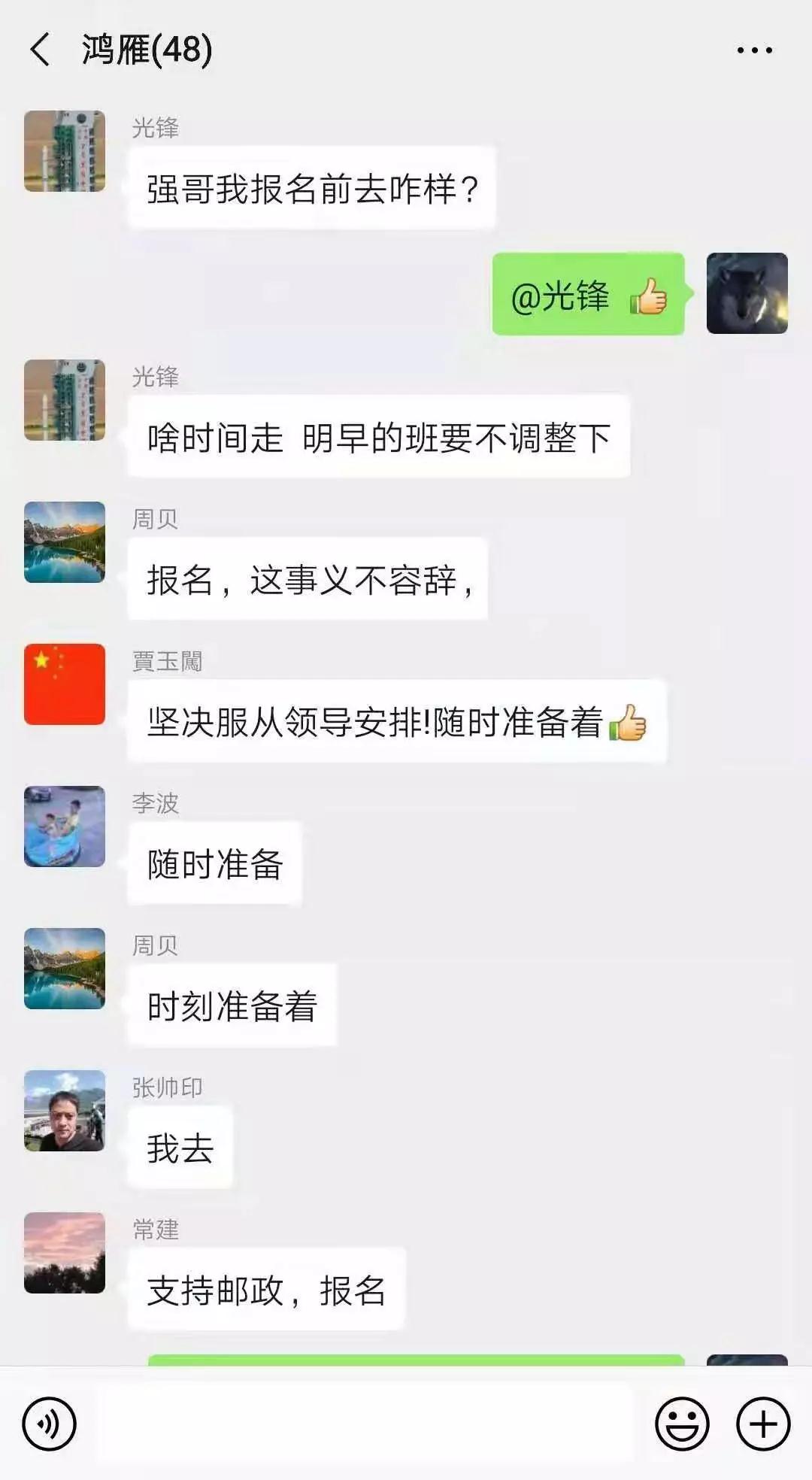 “坚决服从安排!随时准备着”“报名,这事义不容辞”“坚决支持,我报名”……1月26日,在南阳市分公司网运条线微信群里,当得知需要两名同志去武汉运送防疫物资时,许多人纷纷踊跃报名,请战前线,表示要以自己的实际行动为抗击疫情贡献力量。