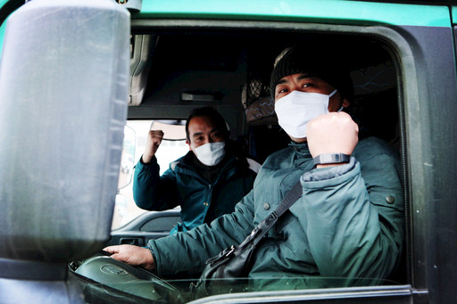 1月29日,连云港分公司万绪法、王晓兵、刘宝、许涛四位司机驾驶载着正大天晴药业集团、江苏新晨医药有限公司521万剂药品的邮车赶往武汉。 □朱言摄