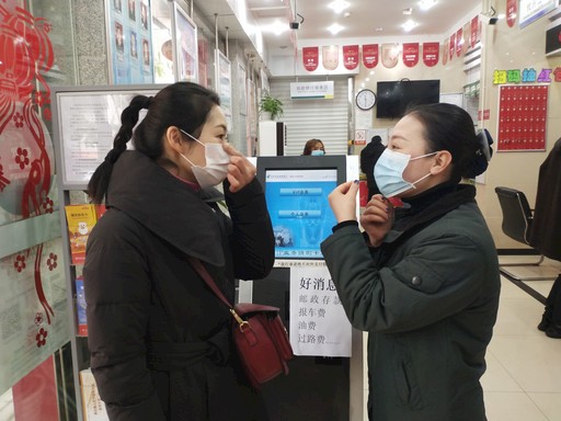 在四川省资阳市乐至县公园路邮政营业大厅内,大堂经理或为客户测量体温,或耐心指导客户怎样正确佩戴口罩,或向客户讲解防疫安全知识,厅堂内秩序井然。