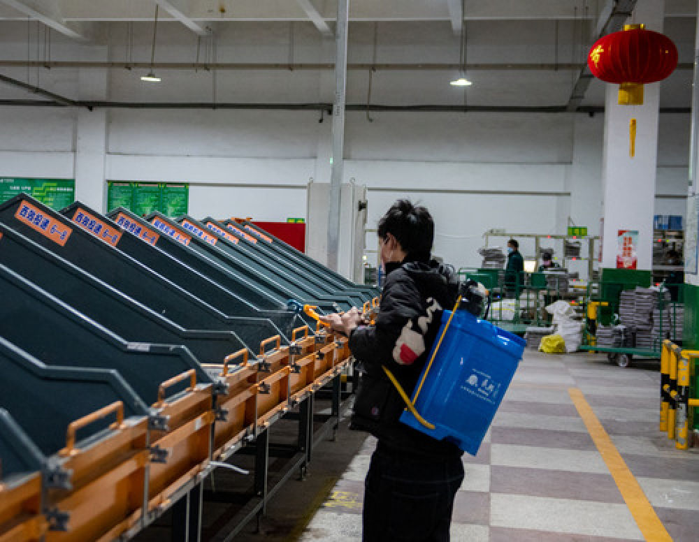 1月31日,在拉萨邮区中心局邮件处理中心,工作人员为邮件分拣机器消毒。 新华社记者 侯捷 摄
