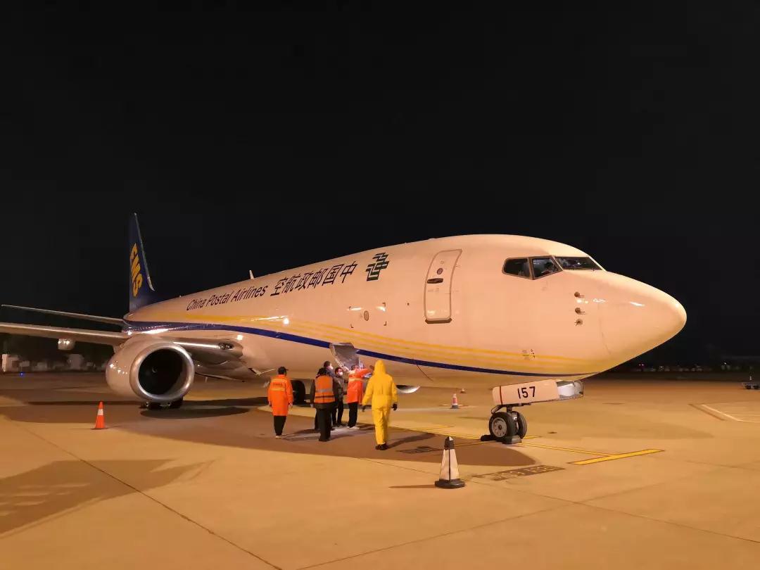 21时18分,邮航CF9117航班在武汉天河机场降落后,邮航武汉办事处人员和天河机场地面保障人员立即展开卸机作业,全部作业流程顺畅有序,仅历时20分钟。一场紧张忙碌的作业后,这批物资已迅速运往需求方处。
