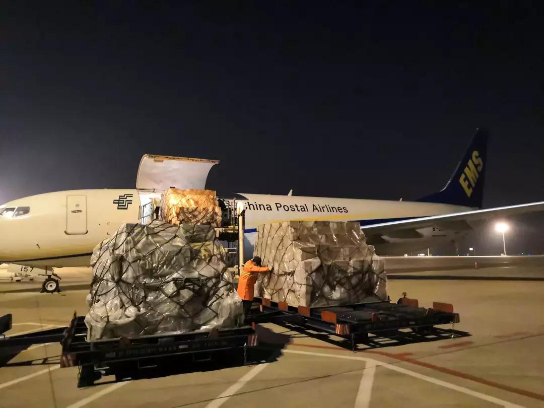 9日16时20分,相关物资到达上海浦东机场邮航作业区后,安检作业和集装板组板作业按序展开。19时13分,完成集装作业的物资被拉运至机坪,夜色中,一架垂直尾翼上喷涂着EMS标识的波音738飞机已经打开舱门等候在这里,装机作业随即进行,可谓环环相扣,争分夺秒。
