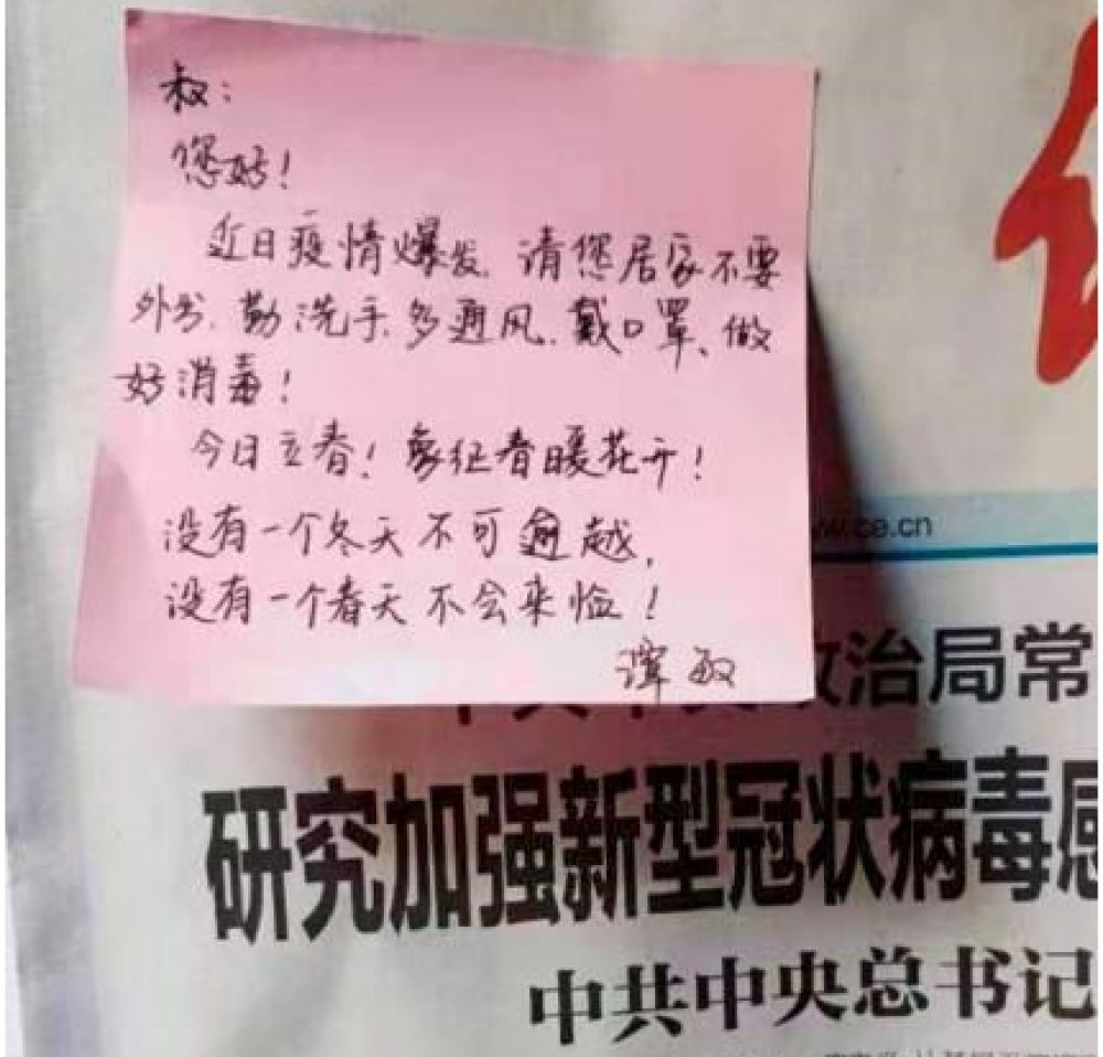 2月4日,正值立春节气。在这个充满希望的日子,谭敏写下了一张张满怀关切的“防疫小纸条”,叮嘱用户们做好自身防护,注意身体健康,要相信“没有一个冬天不可逾越,没有一个春天不会来临”。当天下午,客户李先生在取报纸时,看到了贴在报纸上的小纸条。他立即给谭敏打电话说:“小谭,你的嘱咐我收到了,我和你阿姨很好,谢谢!你每天外出工作,一定要注意安全!”话音未落,谭敏已泪目。