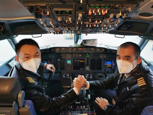 1月27日,黄宏佳(左)执飞首班邮航防疫物资寄递专机,从广州飞往武汉。詹威东 摄