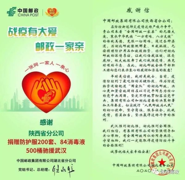 战疫有大爱,邮政一家亲。在武汉急需防疫物资的紧要关头,全国邮政心连心,同呼吸,共命运,坚决扛起“国家队”的责任担当,为武汉送来急需的医疗防疫物资。这其中,陕西省分公司捐赠防护服200套,捐赠84消毒液合计950桶,为湖北邮政抗疫工作提供了有力的支撑保障。近日,湖北省分公司党组书记、总经理任永信专门发来感谢信,向陕西省分公司表示诚挚谢意。