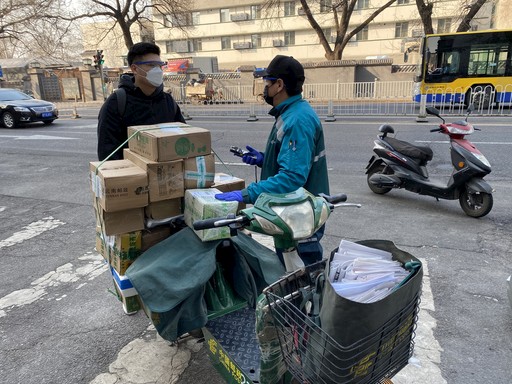 2月19日9点半,寒风中,东四邮局北新桥投递部投递员张志福戴着护目镜、口罩、一次性手套,站在某小区门口,一个接一个地拨通收件人的电话,等待他们来领取包裹。11天前,这个小区出现一例新冠肺炎确诊病例。从那时开始,附近的居民都绕着这个小区走。