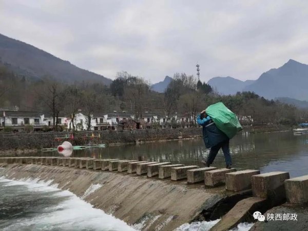 为确保党报党刊、邮件包裹能及时送到客户手中,一位投递员扛着装满包裹的邮袋从河间的石墩上走过。