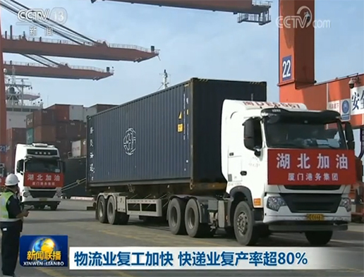 央视网消息(新闻联播):物流业对统筹做好疫情防控和经济社会发展工作具有重要支撑作用,记者从国务院新闻办3月6日举行的发布会上了解到,目前,物流业复工有序,速度加快。