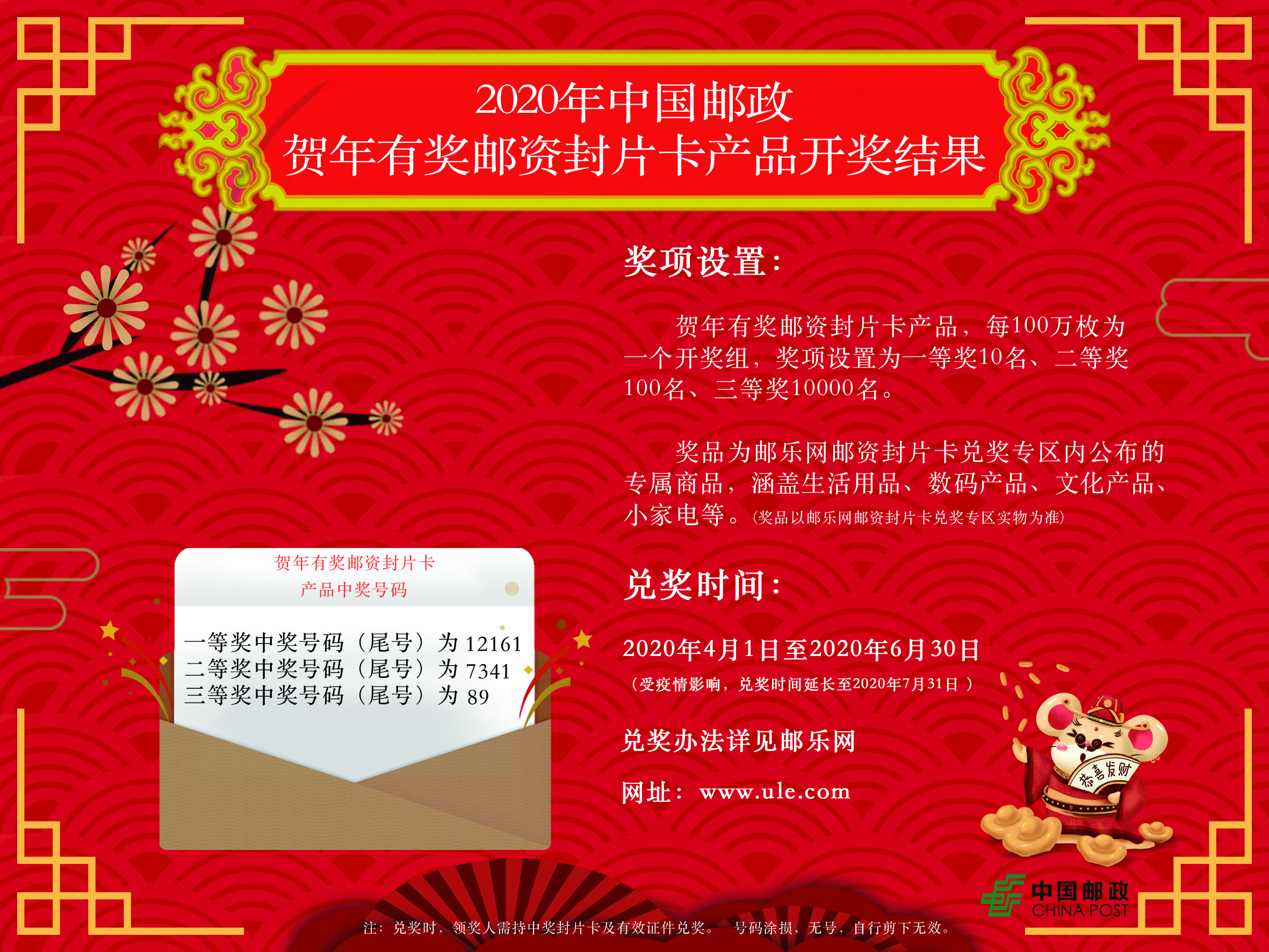 2020年贺年有奖邮资封片卡中奖号码于3月18日产生。现将具体中奖信息通知如下: