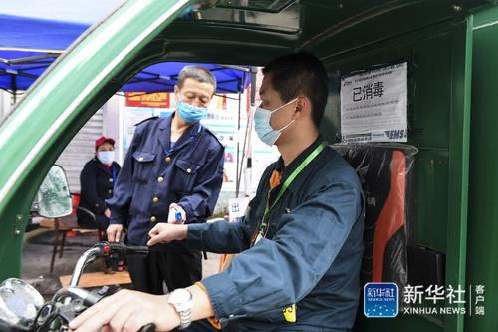 3月23日,广西南宁邮政部门工作人员在进小区前配合工作人员测量体温。
