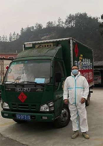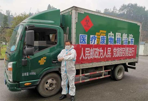 得知消息后,州邮政公司员工、退役军人尹江、向耀俊、江道权做通家属工作,主动要求参与转运工作,火线组建突击队,驾邮车出征高危战场,为定点收治医院转运医疗废弃物。