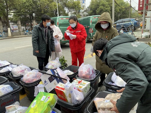 在湖北荆州,当地邮政为小区居民配送生活物资。熊程程 摄