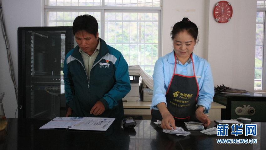 桑南才与妻子蜜晓琴在邮政所收寄邮件(5月11日摄)。(新华网 赵普凡 摄)