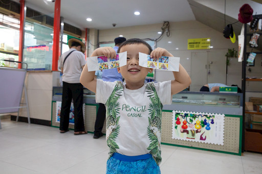 6月1日,重庆市沙坪坝区三峡广场邮政支局门前,前来购买《动画—葫芦兄弟》邮票的小朋友和家长络绎不绝,邮票上栩栩如生的葫芦兄弟形象吸引了小朋友的目光。三峡广场支局还特意为到场的小朋友准备了葫芦兄弟同款服装,供小朋友拍照留念。一位小朋友穿上葫芦兄弟服装后,在支局门前兴奋地手舞足蹈。 □朱亚坤 摄影报道