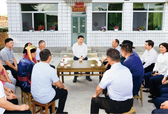 2019年7月15日至16日,中共中央总书记、国家主席、中央军委主席习近平在内蒙古考察并指导开展“不忘初心、牢记使命”主题教育。这是15日下午,习近平在赤峰市喀喇沁旗河南街道马鞍山村村民张国利家,同基层干部群众代表座谈交流。 新华社记者 谢环驰/摄