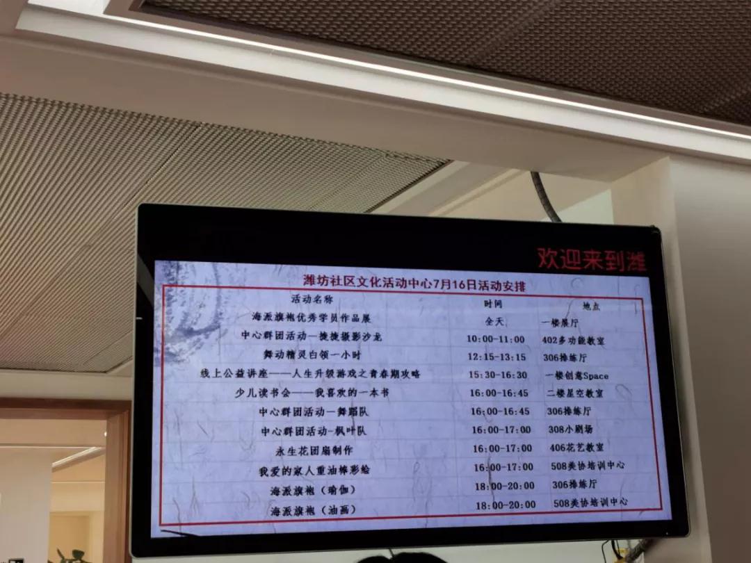 图为潍坊社区文化活动中心一楼的电子显示屏,罗列了当天的各项活动安排。求是记者 侯亚景 摄