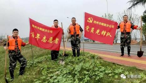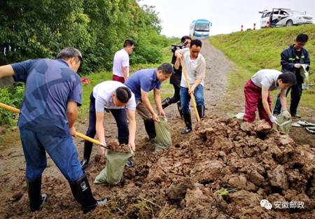 安徽各地邮政企业服从地方政府调度,发动党员员工组建了10多支、100多人的党员先锋队、青年突击队,奔赴抗洪抢险一线,参与驻点值班、巡堤和沿河巡检等工作,及时通报水情和汛情。