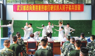 “八一”建军节前夕,武汉邮政艺术团走进驻守长江大桥的武警部队军营,为官兵送去《强军之路》邮册等邮品和书籍,并表演了精彩的文艺节目。部队官兵也为前来慰问的邮政工作人员表演了精彩的擒拿格斗和舞狮节目,营造了双拥共建促和谐的浓厚氛围。多年来,武汉邮政通过“拥军邮路”积极关心军营战士,提供不间断、多元化的邮政服务。在今年疫情防控期间,武汉邮政不间断投送党报党刊和各类物资,得到了官兵们的一致好评。□肖芳 摄影报道