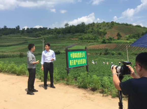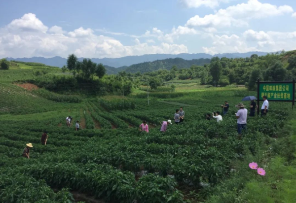 天气晴朗,微风吹拂,在一望无际的绿色田野里赫然伫立着一块“中国邮政集团(有限)公司朝天椒产业扶贫基地”的绿色标牌。